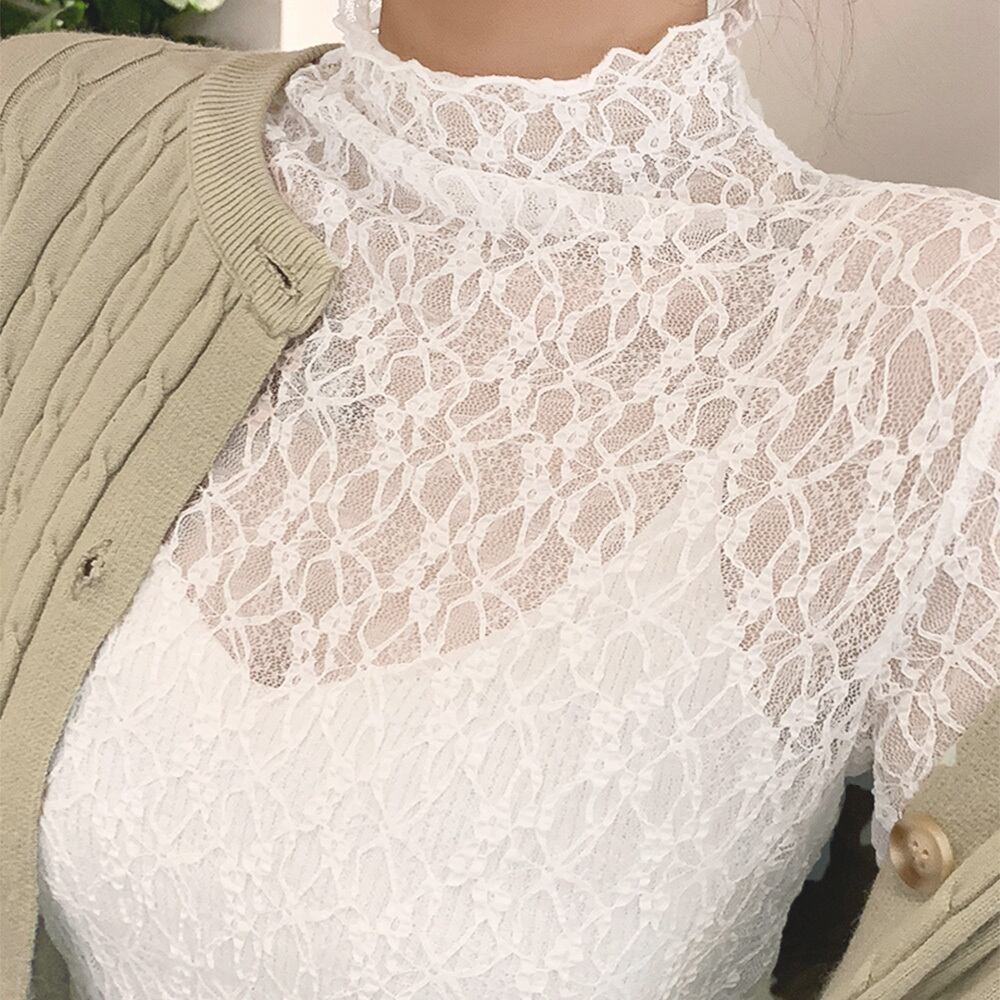 ふんわり着こなせる質感で女性らしさを感じるプチハイネックレースブラウス
