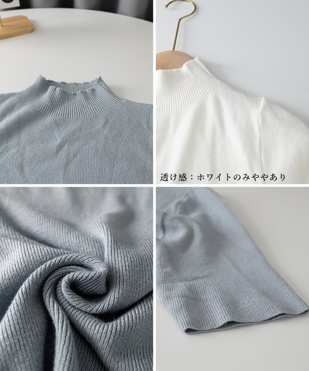 リブ編み仕様のプチハイネックは露出度が控えめ、ビジネスシーンでも使える