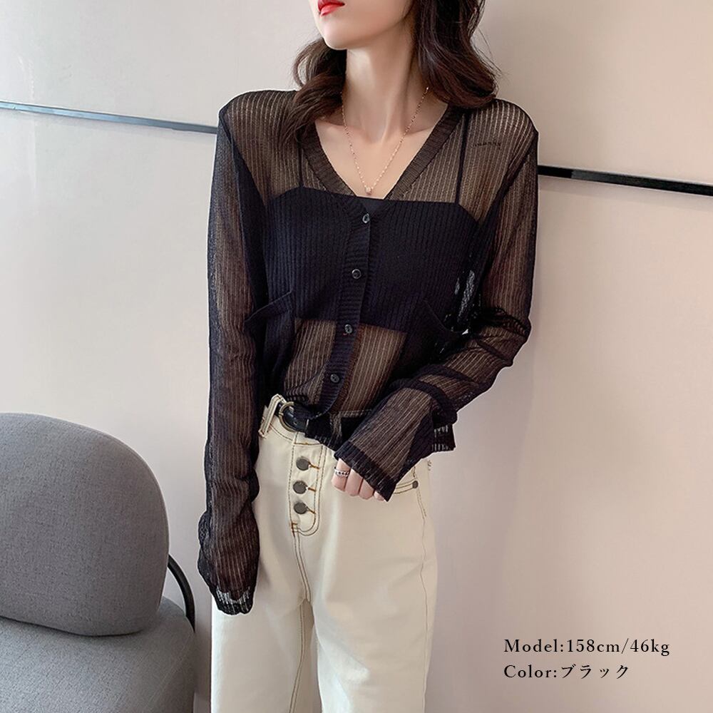 レディース UV 紫外線対策 Vネック 羽織トップス 着やせ サマーニット 前開き 透け感 長袖 サマーカーディガン
