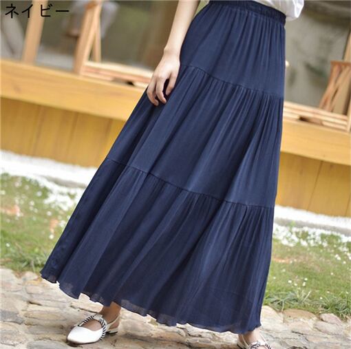 フレアロングスカート レディース スカート ウエストゴム裏地付き 涼しい 春 夏 6colors