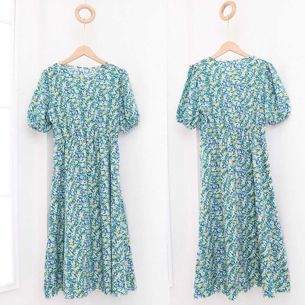 大人可愛い リゾートワンピース クルーネック 総柄 パフスリーブ 半袖 サマーワンピ フラワー柄 体型カバー きれいめ