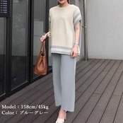 サマーニット スリットトップス ワイドパンツ 2点セット ゆったり オフィスカジュアル フレンチ袖ニット きれいめ 薄手