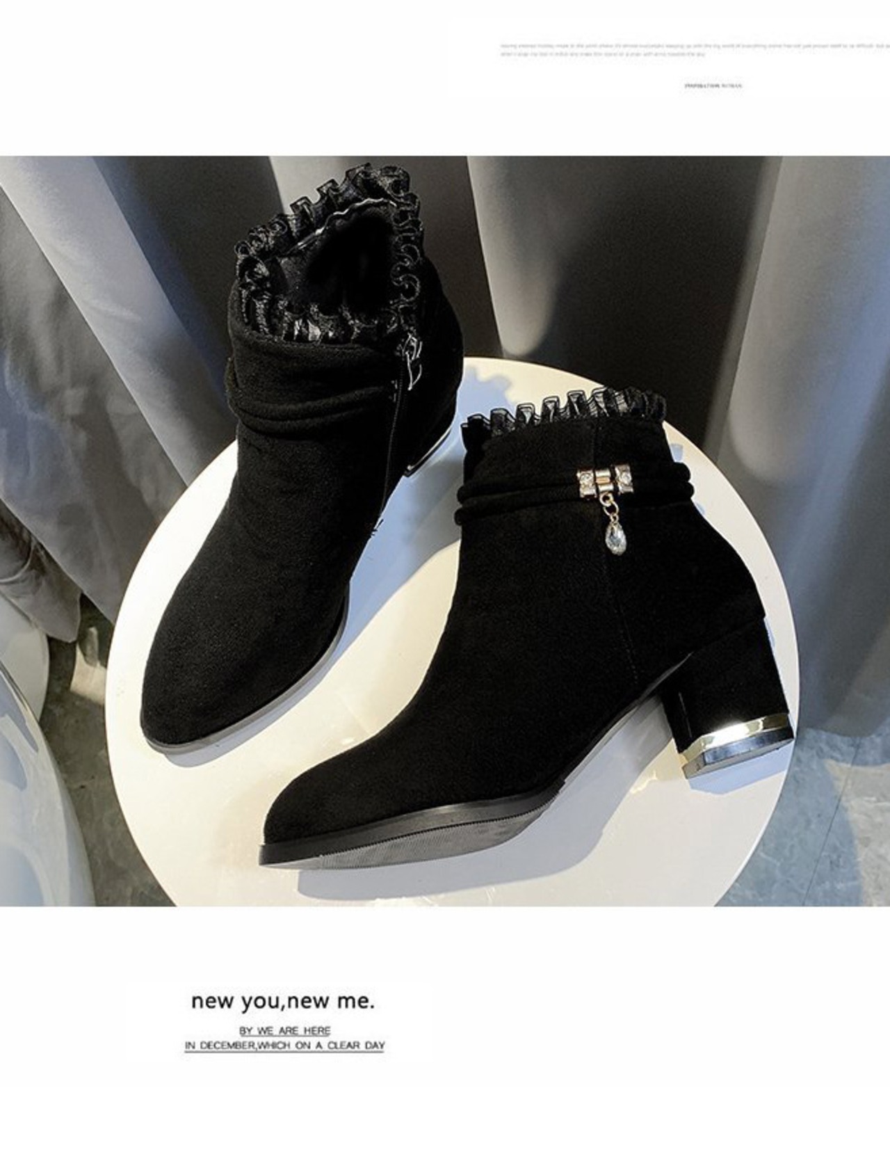 スエード調×レースフリルでより女性らしいデザイン アンクルブーツ