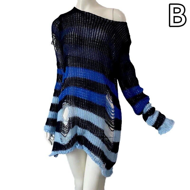 トップス ニット セーター 毛糸 ボーダー ダメージ加工 パンクファッション レディース