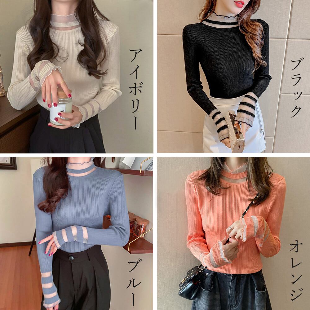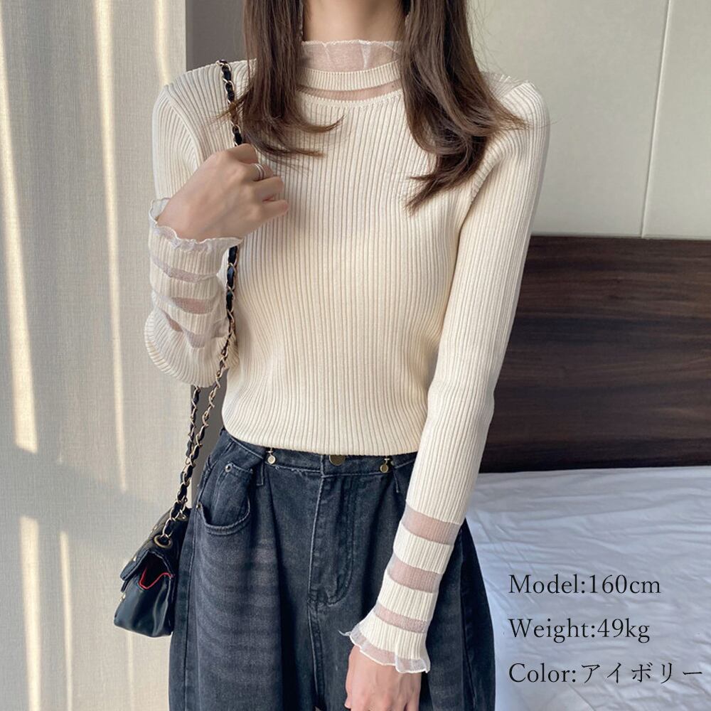ニットトップス レース プルオーバー 切り替え ニットソー ハイネック