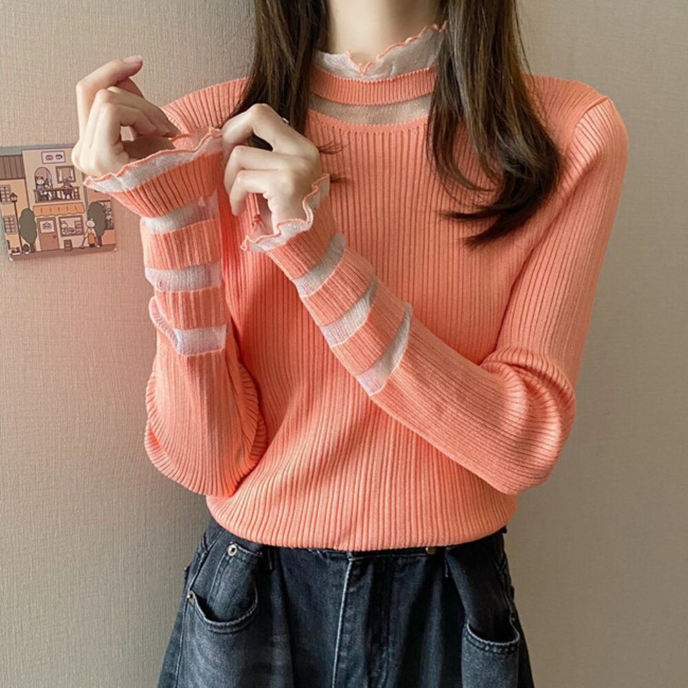 袖と襟にプリーツレースがついたフェミニンなハイネックニットトップスです