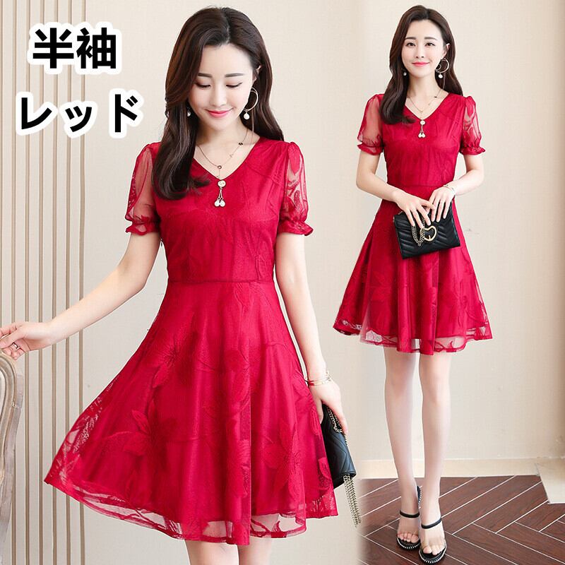 フレアワンピース 膝丈 レースワンピ Vネックワンピース 半袖